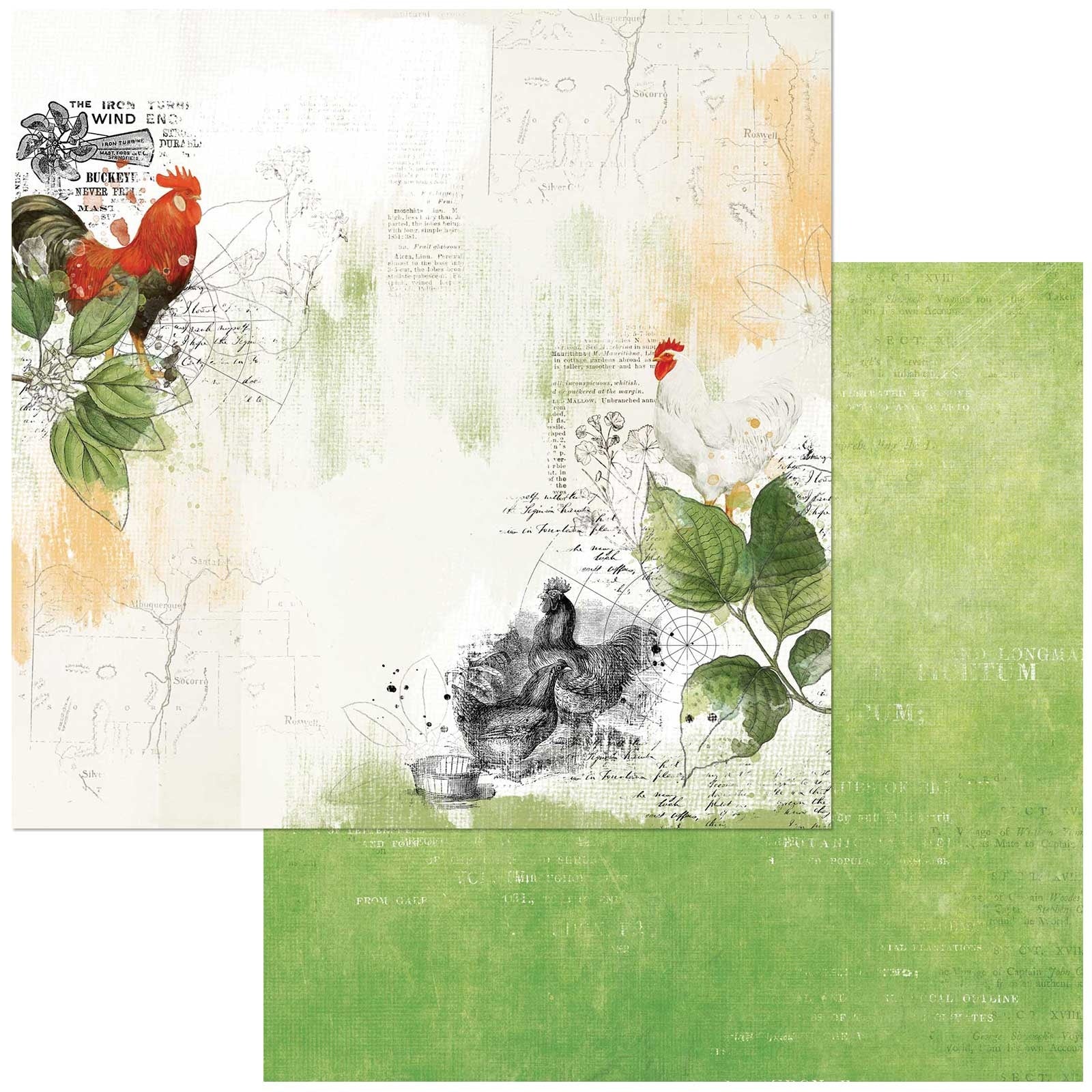 The FRONT of this paper is a white background with chickens and roosters on the sides and faded text in the background.