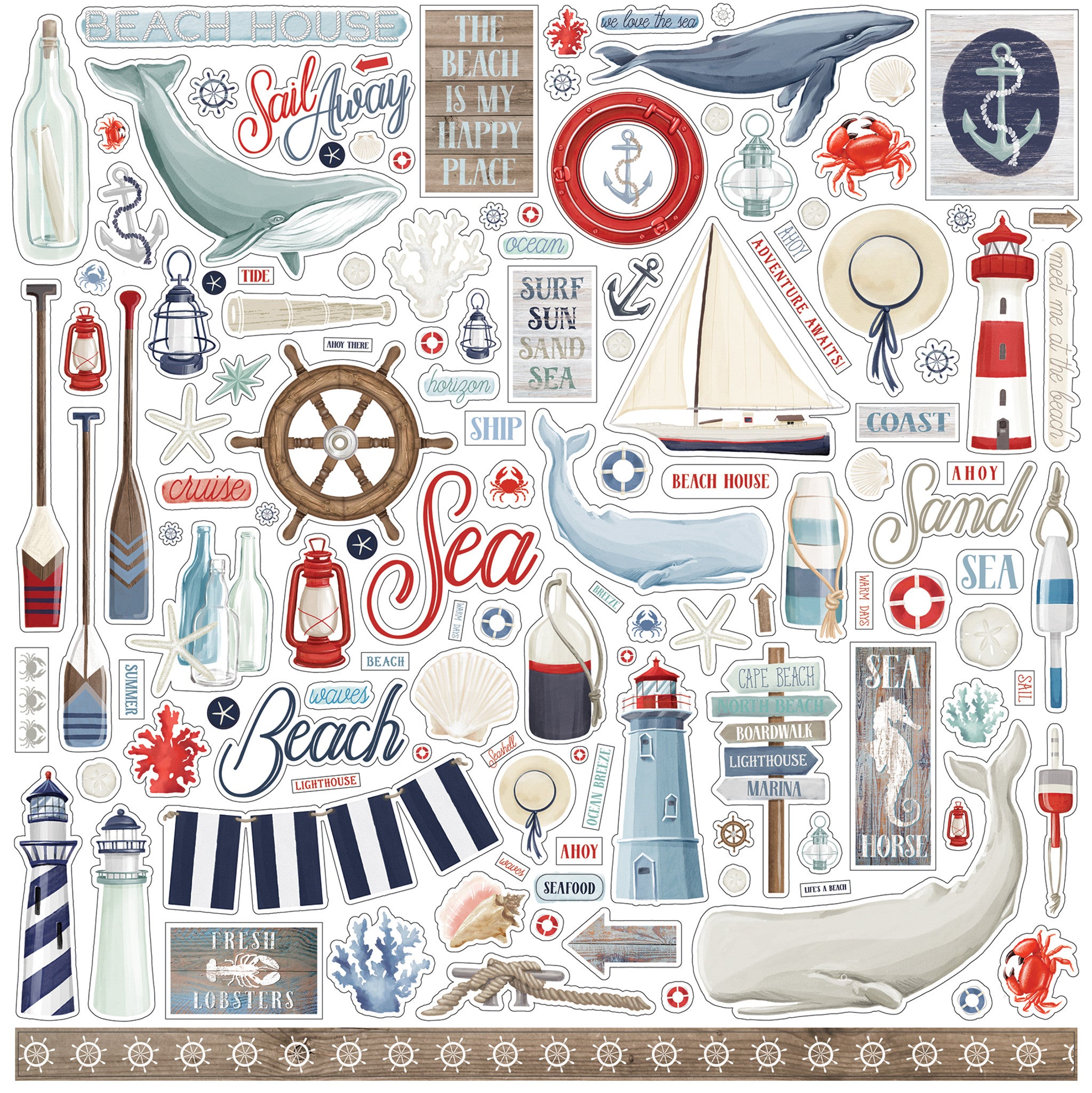 This sticker sheet features banners, border pieces, large words such as BEACH and SEA, tags, framed images, oars, whales, lighthouses, and more.