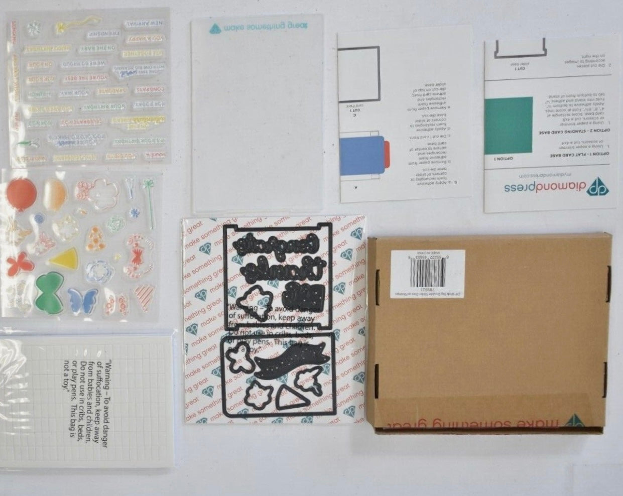 - Contains: Clear Stamps, Metal Dies, Stamp Plate & Foam Adhesive Squares