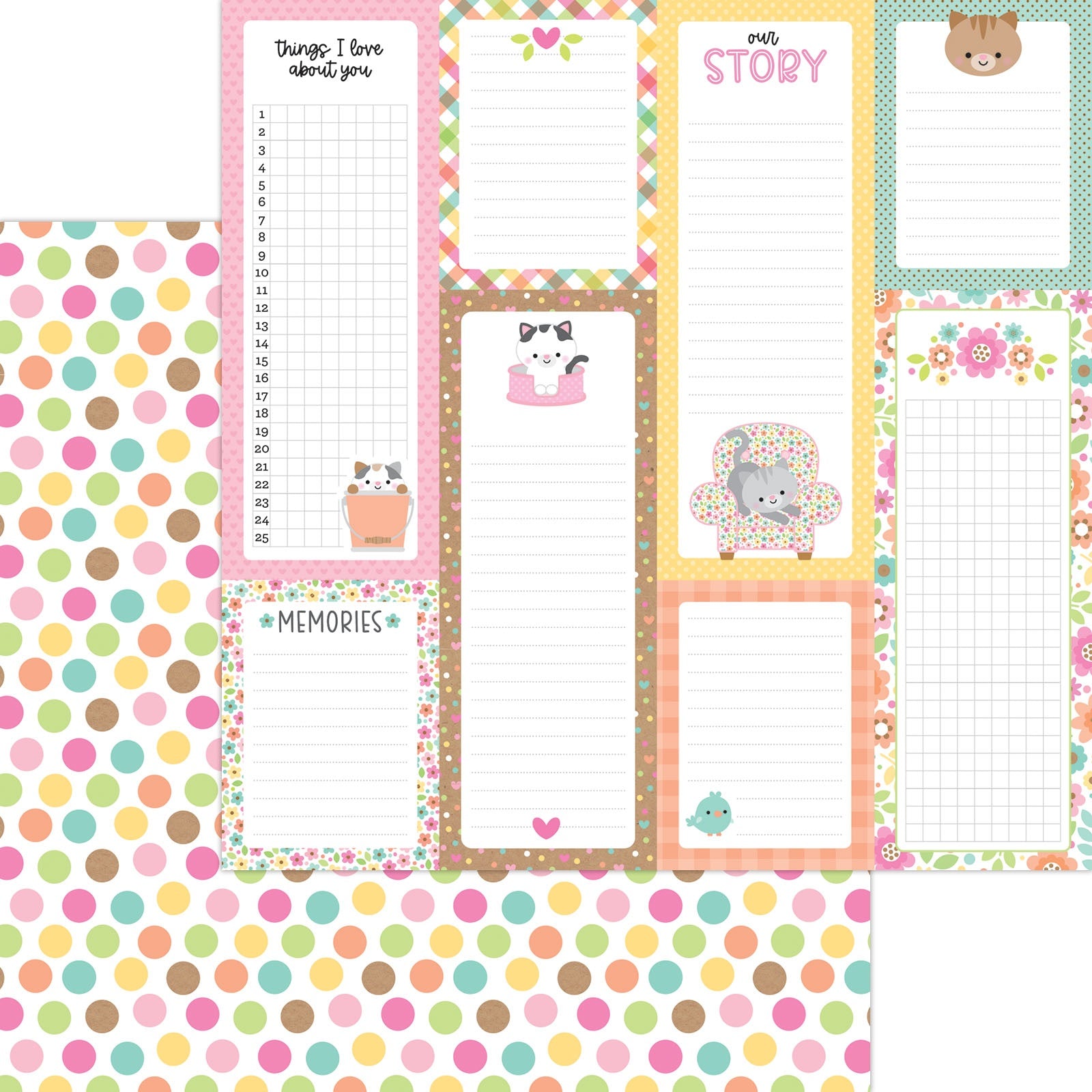 - Front has 8 journaling cards, each with a different design.