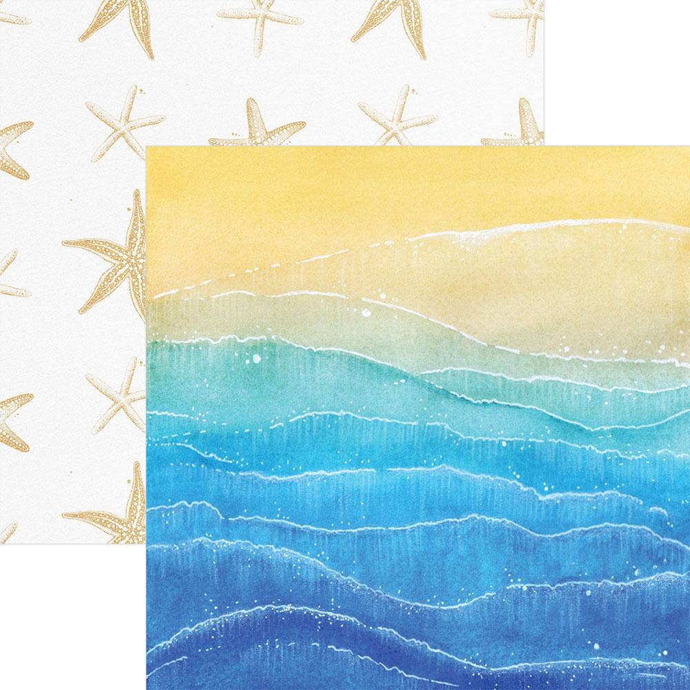 Here we have Painted Waves 12 x 12-inch scrapbook paper in tones of blue and gold. Evocative and beautiful, with charming starfish on the flip side. Double-sided scrapbook paper made of vibrantly colored heavyweight stock – acid and lignin-free – perfect for scrapbooking, card-making, travelers notebook and planner embellishment, wall art, and many more uses! Made in the United States.